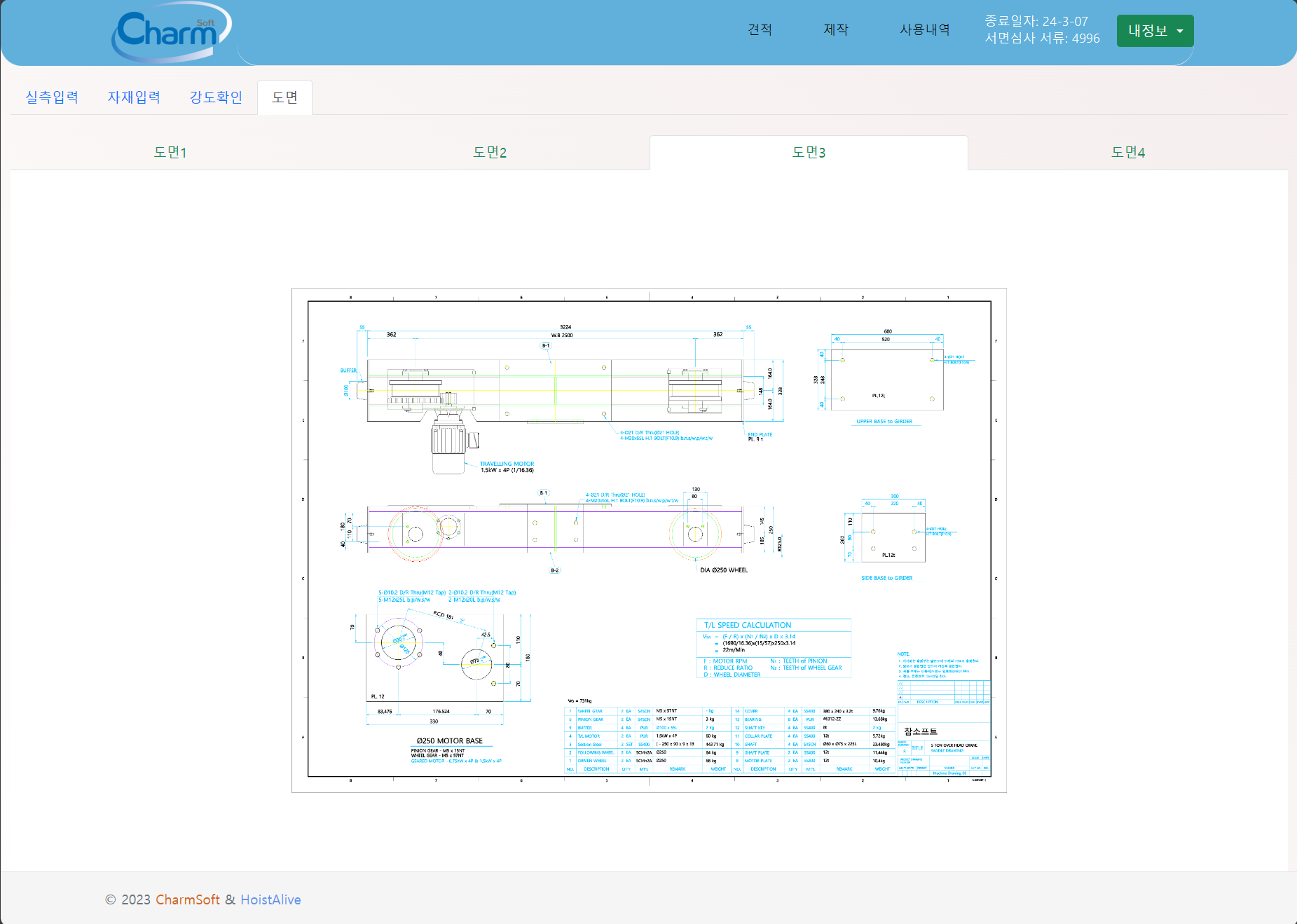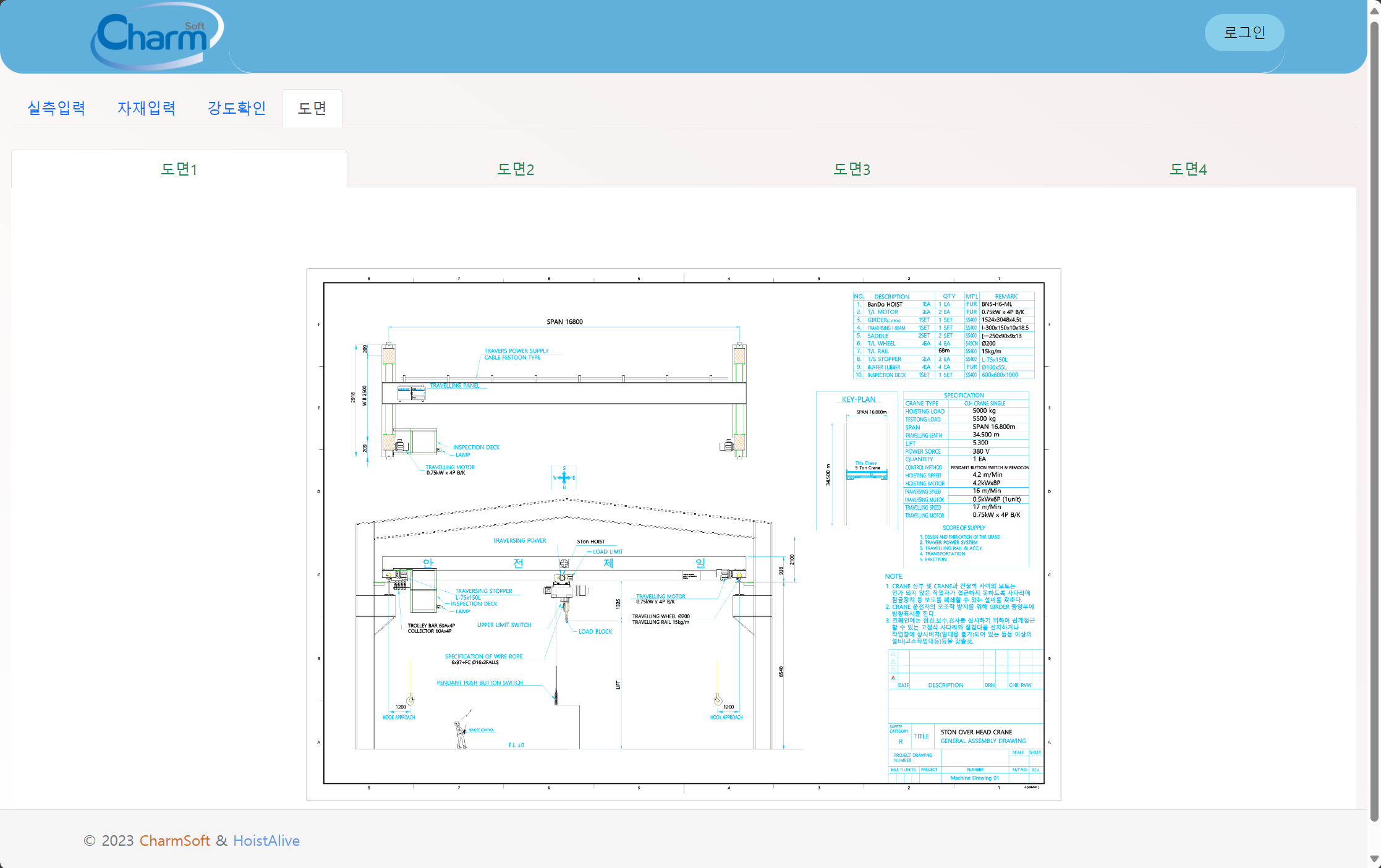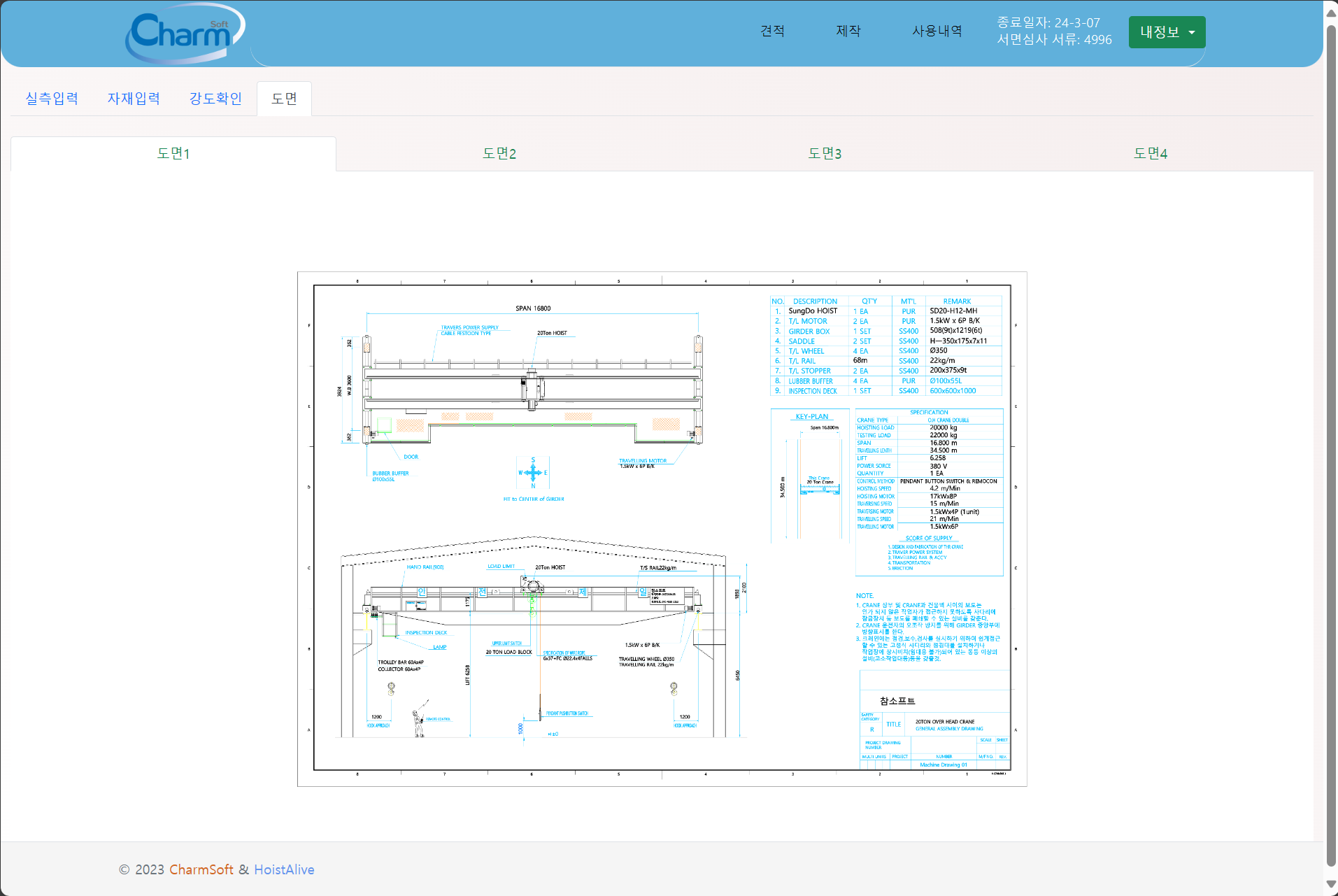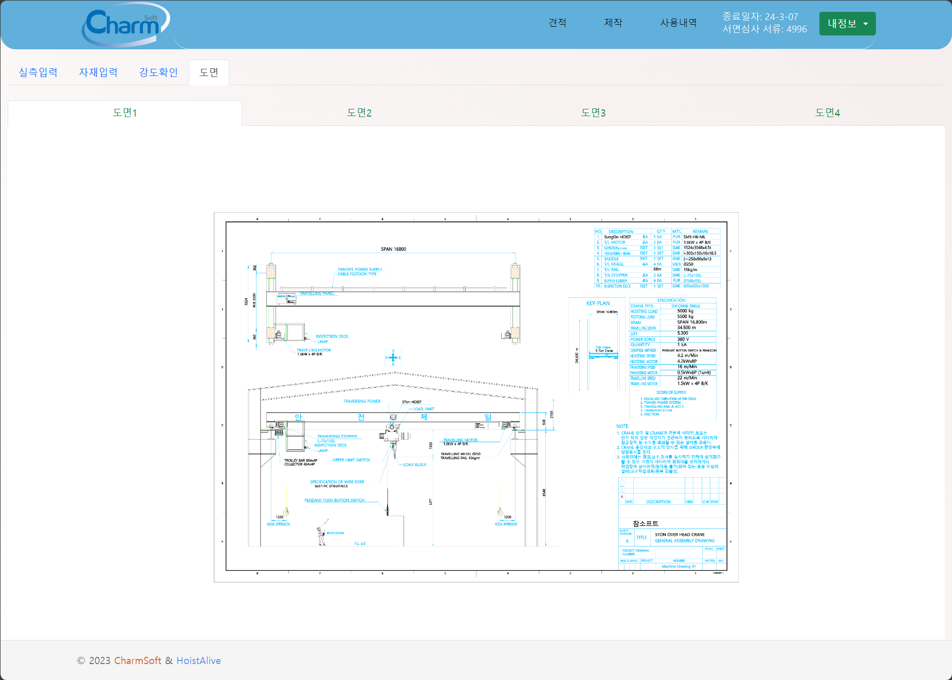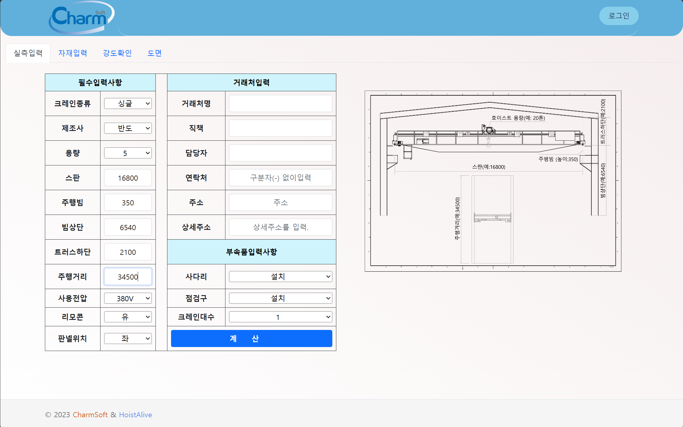 천정형 크레인 제작을 위한 기본 데이터(용량, 스판, 주행거리등)만을 입력하면