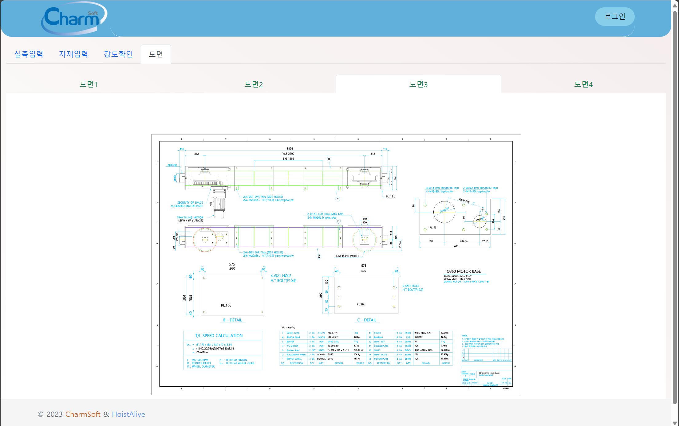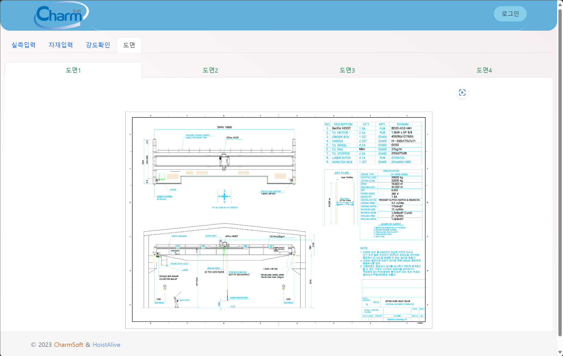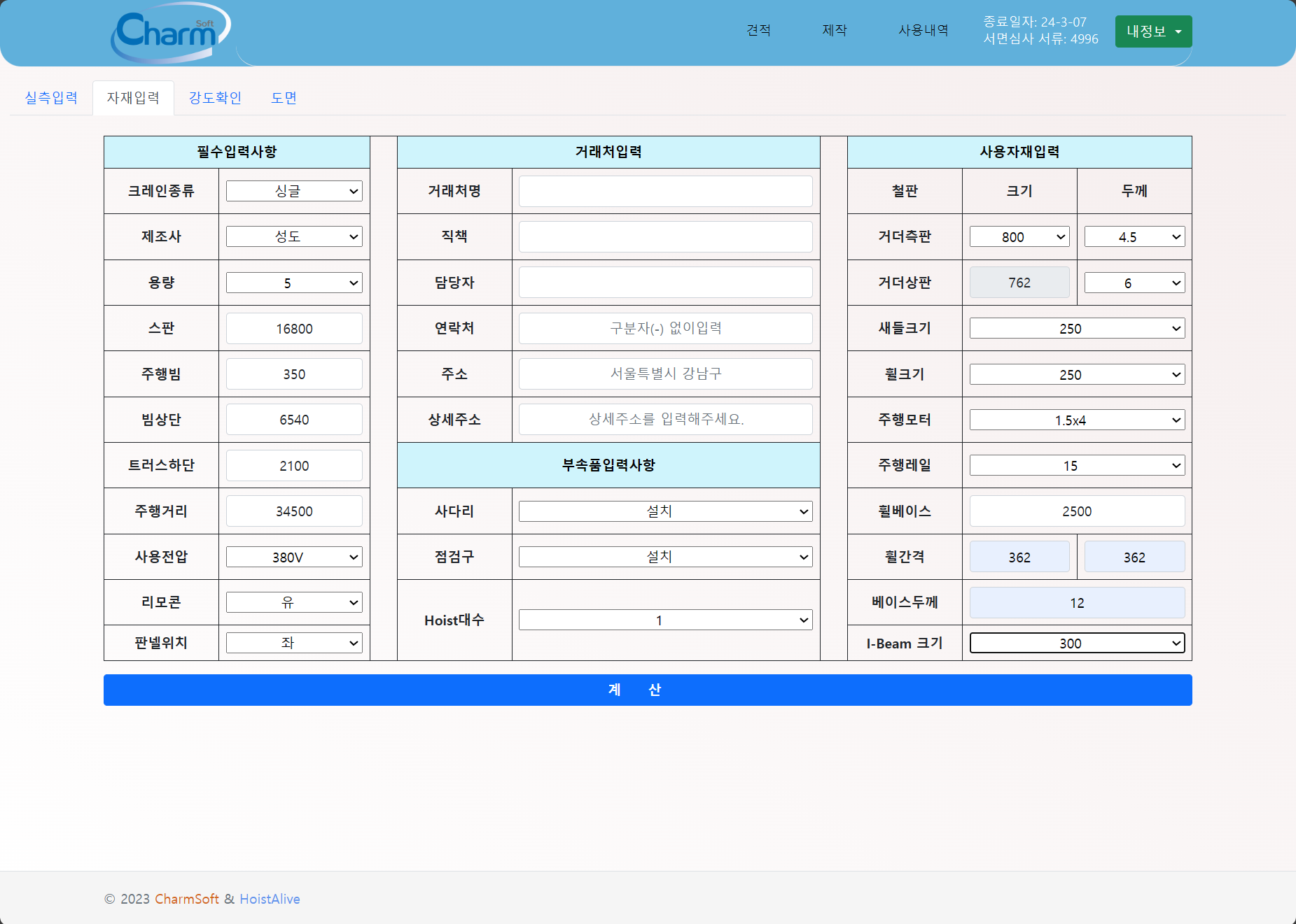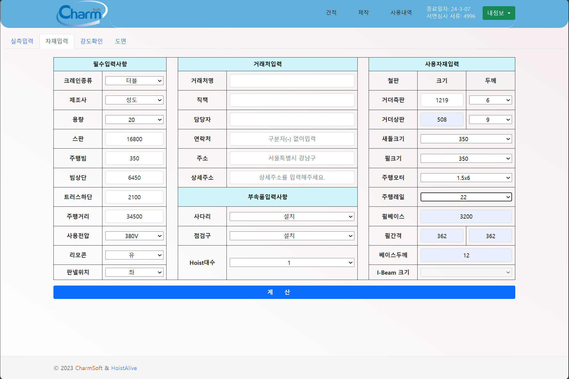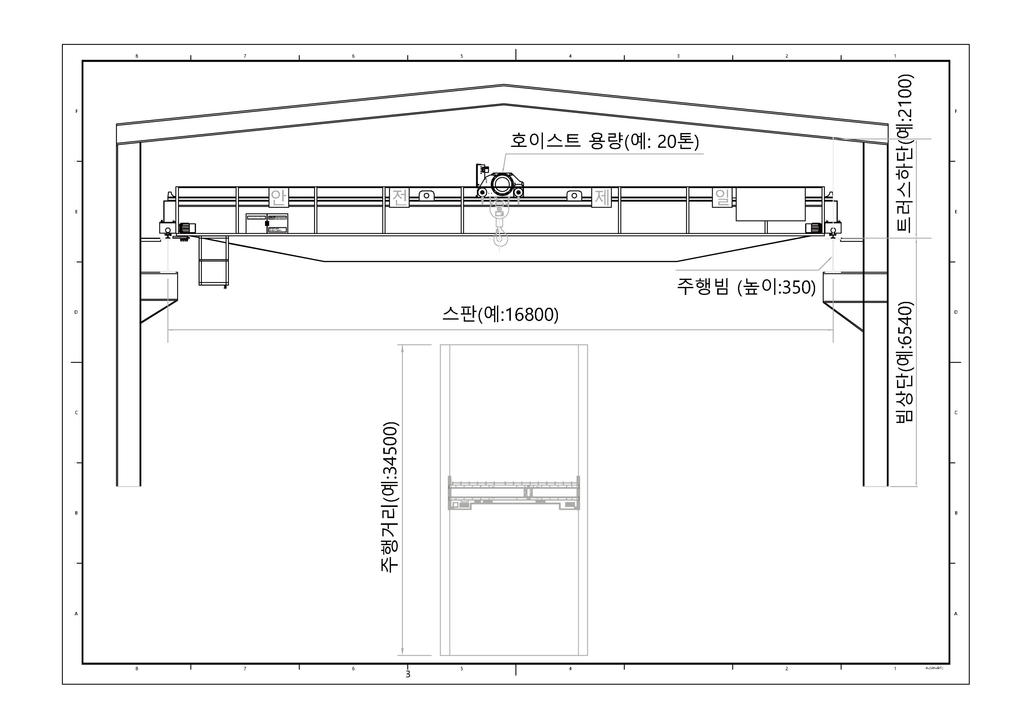 천정형 크레인 제작을 위한 기본 데이터(용량, 스판, 주행거리등)만을 입력하면